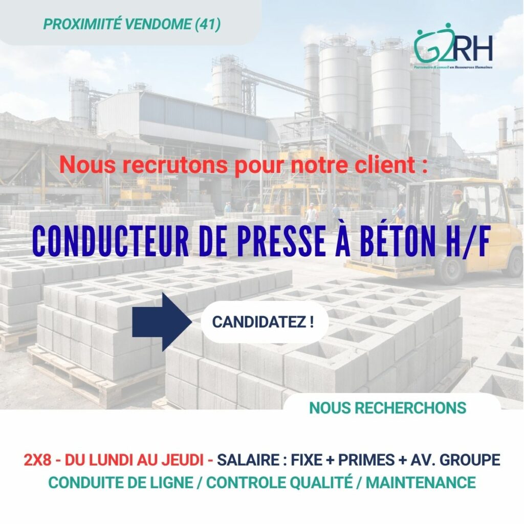 Lucie LUROT, consultante pour le cabinet, recrute aujourd’hui pour le compte de son client, un groupe familial et local reconnu pour son expertise dans la fabrication d’équipements pour le TP, BTP et génie civil, un.e Conducteur de presse à béton H/F en CDI, pour l’un de ses sites historiques.