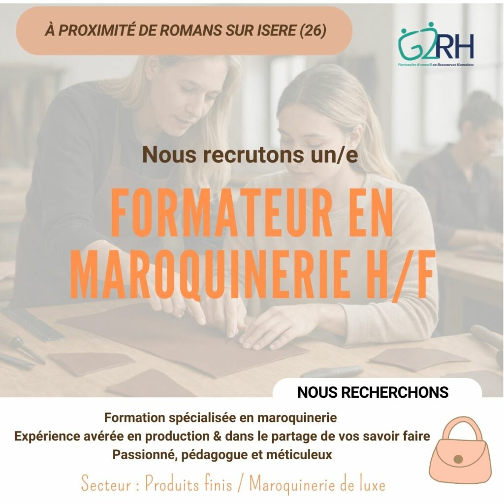 Lucie LUROT, consultante en recrutement au sein du cabinet G2RH, accompagne aujourd’hui un acteur reconnu de la maroquinerie haut de gamme et luxe dans le recrutement de son Formateur en Maroquinerie H/F (Ll11100020-2)