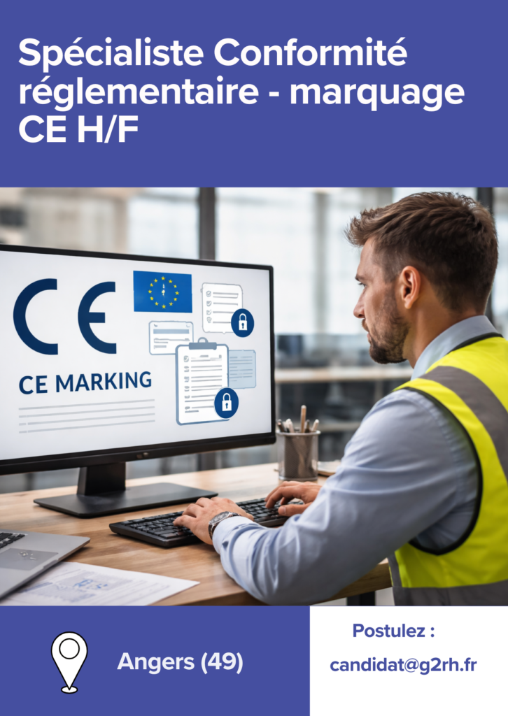 Dans le cadre d’une création de poste, Ophélie BARAT, consultante au cabinet G2RH, recrute un/une Spécialiste Conformité réglementaire – Marquage CE H/F afin d’apporter une prise de hauteur sur les sujets réglementaires et de structurer la démarche de conformité.
