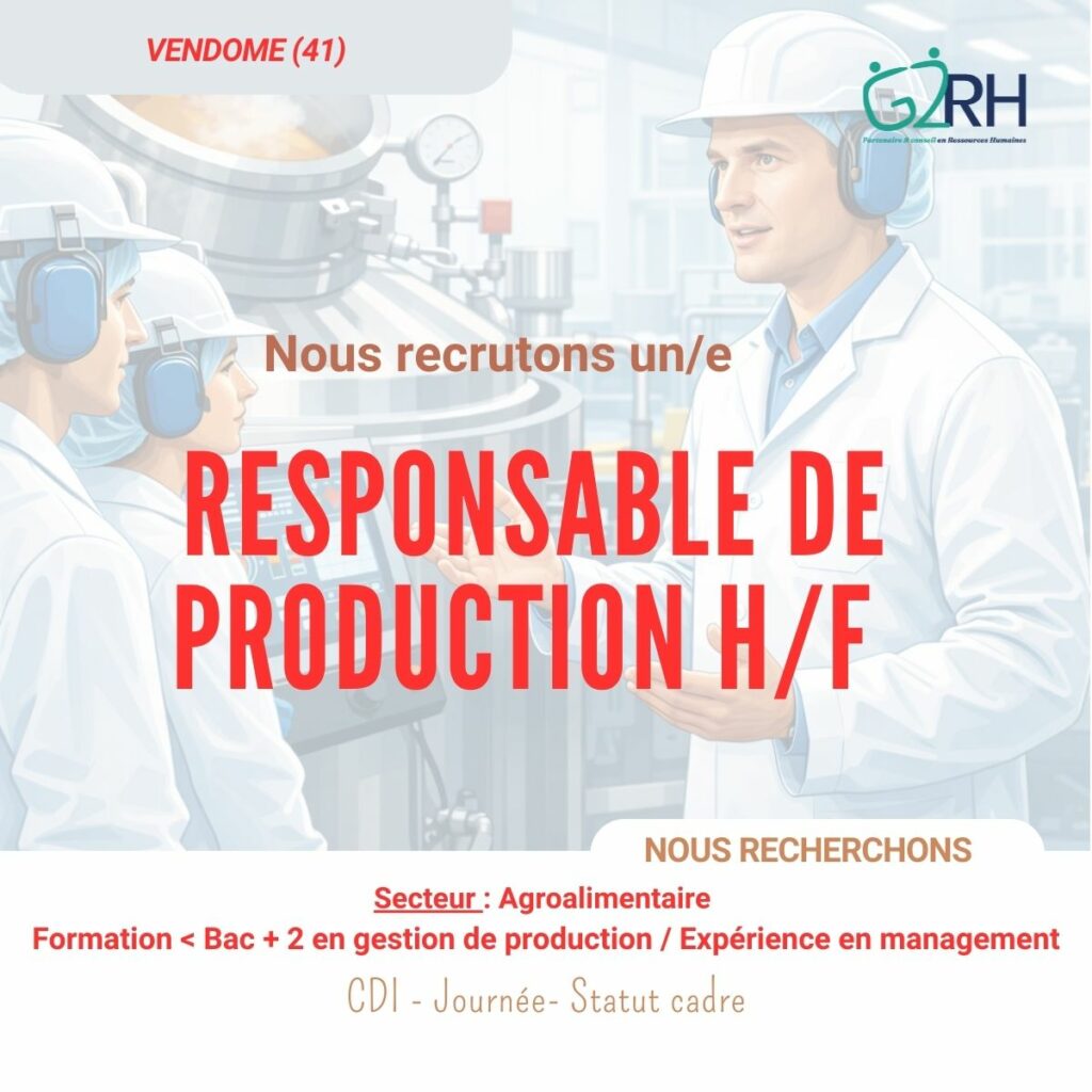 Lucie Lurot, consultante en recrutement au sein du cabinet G2RH, recrute pour un acteur de référence dans le vendomois un(e) Responsable de production H/F (LL11100022).